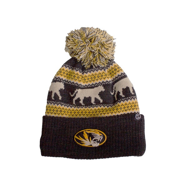 Stay warm while showcasing your University of Missouri pride with the Grey and Gold Zephyr Tiger Repeat Sweater Design Beanie with Pom. This cold-weather essential blends comfort, style, and Mizzou spirit in a classic knit silhouette perfect for winter gamedays, tailgates, and everyday wear.
