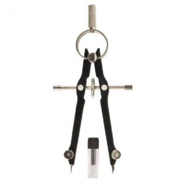 All metal compass features extra pivot point for use as a divider. Creates circles up to 8" in diameter. Includes replacement needle and lead. Assorted colors, no choice.