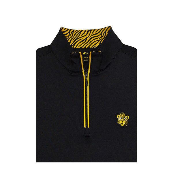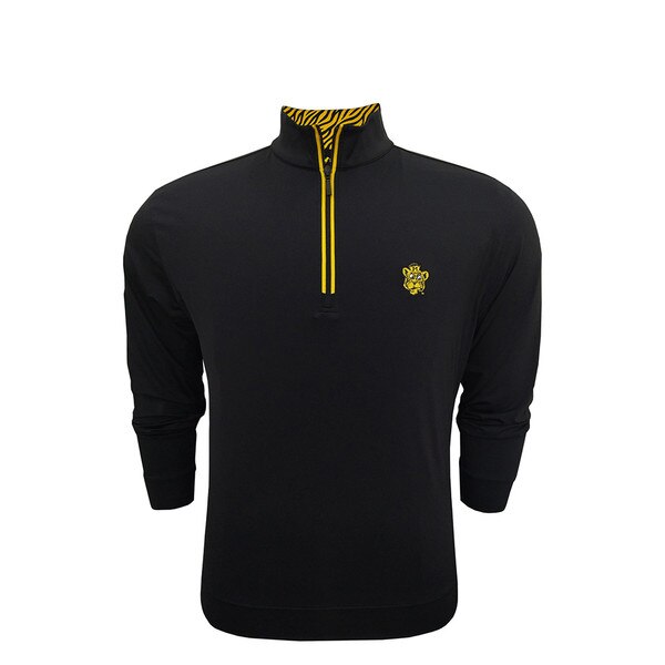 Stay sharp and show your Tiger pride with the Black Horn Legend 1/4 Zip Pullover, designed with performance comfort and bold Mizzou style. Featuring the Beanie Tiger logo embroidered on the left chest, a striking yellow zipper, and a tiger stripe patterned inner collar lining, this pullover blends classic athletic design with premium Horn Legend craftsmanship. Perfect for layering, it transitions seamlessly from the stadium to the office or golf course.
