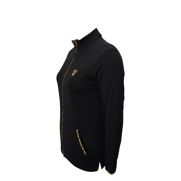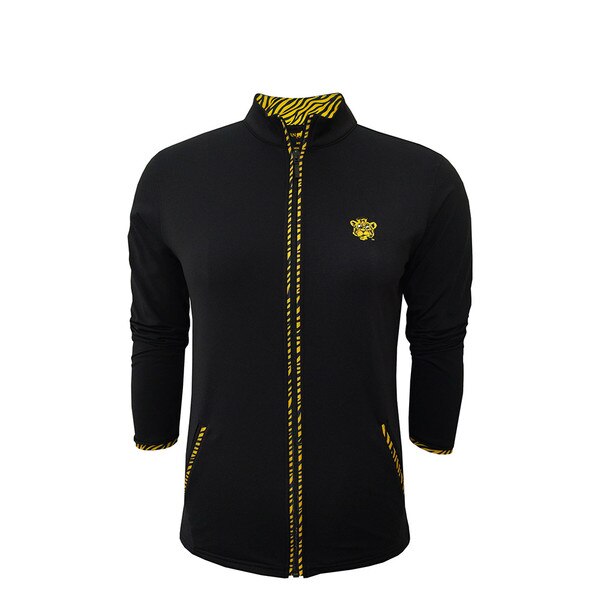 Full-zip jacket in black with gold tiger stripe detailing for standout contrast