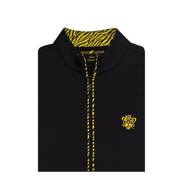 Layer up with timeless style and bold school spirit in the Black Horn Legend Full Zip Jacket, designed with the Mizzou Beanie Tiger logo embroidered on the left chest. Built from performance fabric for comfort and durability, this jacket features tiger stripe accents along the inner collar, zipper trim, pockets, and cuffs. It’s a versatile piece perfect for cool game days, business casual settings, or everyday wear.