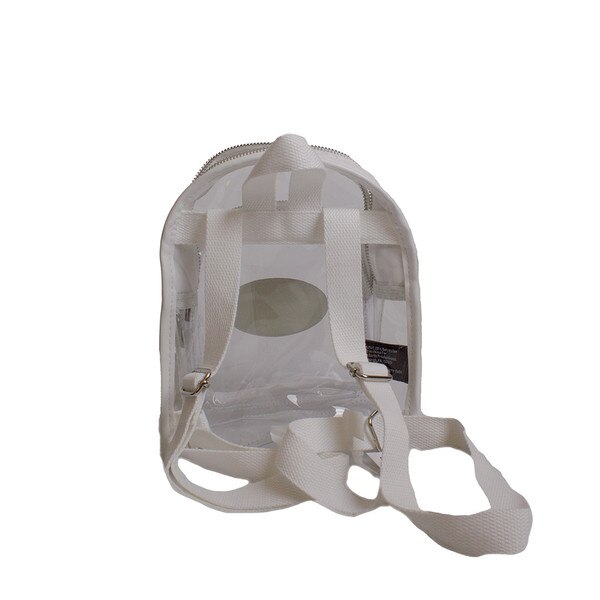 Crafted from durable, clear PVC material, this Mizzou clear backpack combines style and practicality. The spacious main compartment offers ample room for essentials like water bottles, notebooks, or a small sweater, while the front zip pocket keeps smaller items organized and within easy reach. The adjustable white straps provide a comfortable, customizable fit, and the zippered closures ensure your belongings stay secure throughout the day.