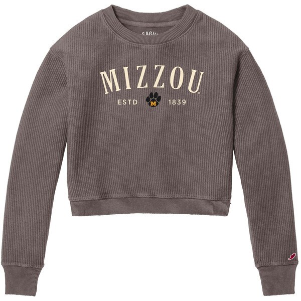 Showcase your Missouri pride with this Mizzou cropped crewneck sweatshirt in charcoal gray. Featuring bold “MIZZOU” lettering across the chest, accented with a paw print and “ESTD 1839” graphic, this sweatshirt pays tribute to the University of Missouri’s legacy while keeping your style modern and fresh.