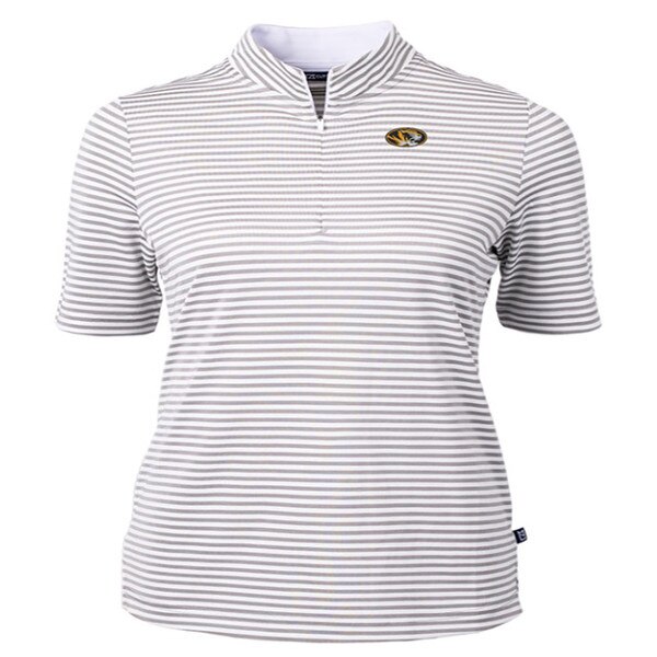 Show off your Tiger pride with understated elegance in this women's striped Mizzou polo shirt by Cutter & Buck. Featuring a modern mandarin collar and sleek half-zip placket, this white-and-gray performance top is perfect for elevating your game day or office attire. The University of Missouri logo is subtly embroidered on the chest, delivering a sophisticated nod to your alma mater.