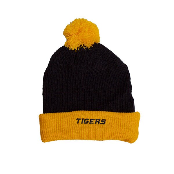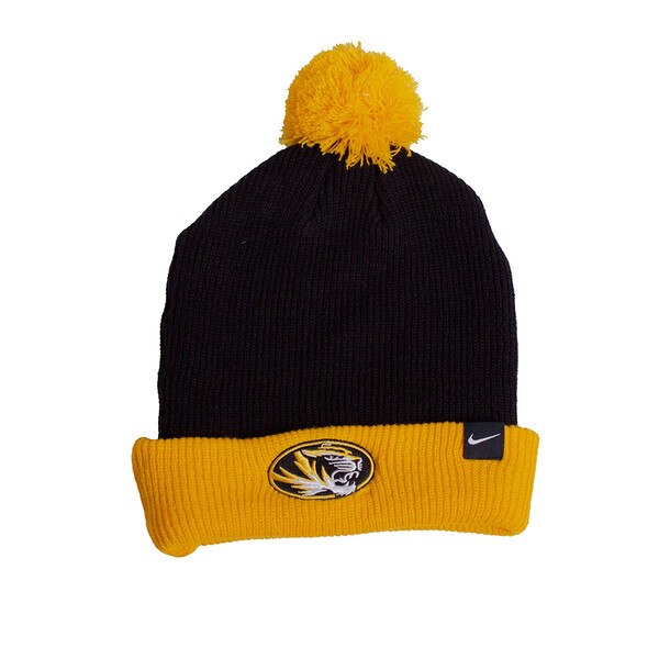 Stay warm while showing your Mizzou spirit with the Nike Black and Gold Oval Tigerhead Beanie with Pom. This officially licensed University of Missouri knit hat features a two-tone design with a black crown, gold cuff, and a matching gold pom on top for a classic collegiate look.