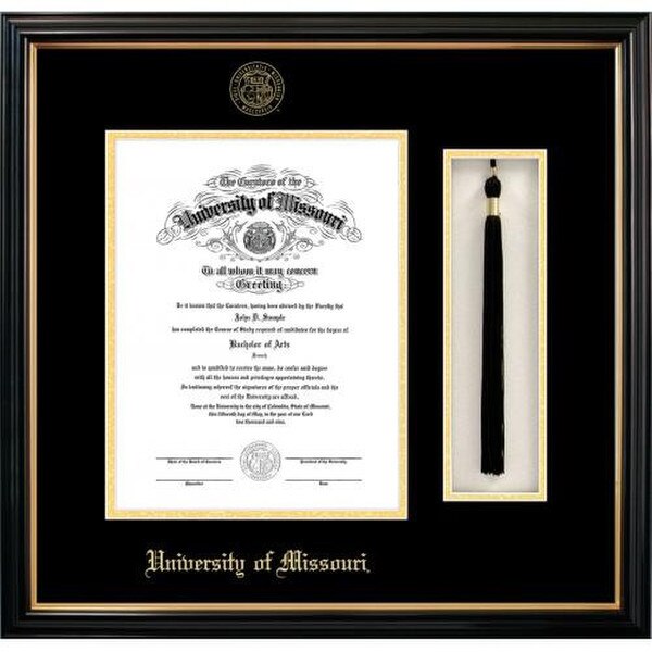 Display your tassel as well as your diploma in this elegant frame. We use our same fine quality hardwoods to create a smaller moulding and finish it in a high gloss black lacquer with gold inner lip. The UMC official seal is embossed on black and gold museum-quality matting.