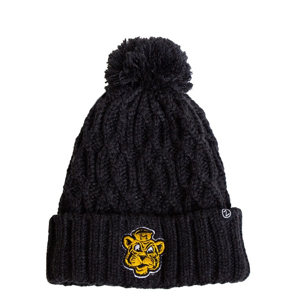 Keep warm while showing your Mizzou pride with this Zephyr Black Knit Pom Beanie featuring the classic Tiger logo embroidered on the cuff. Designed with a cozy cable-knit pattern and topped with a soft pom, this beanie combines timeless winter style with bold University of Missouri spirit.