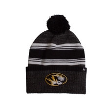 Gray, Black, and Gold '47 Missouri Script Oval Tigerhead on Striped Cuff Beanie with Pom