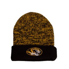 Gold, Black, and White Zephyr Mizzou Repeat Teardrop Design Oval Tigerhead on Cuff Beanie with Pom