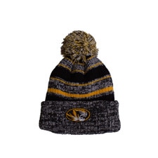 Black, White, and Gold Zephyr Mizzou Bold Text Stripes Oval Tigerhead on Cuff Beanie with Pom